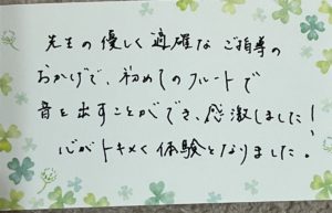 【体験レッスン】フルート♪大人の生徒さん ブログ 2023.04.02 憧れだったフルートを吹いてみたい!勇気を持って体験レッスンを受けにきてくださった生徒さんはじめは吹く部分の頭部管のみでのレッスンの予定でしたがはじめてとは思えないほどすぐに音が出てタンギングも上手にできていたので欲張って、楽器をつけて運指を覚え音を出してみました☺️2重奏をして体験レッスンを終え、楽しい体験レッスンになりました♪はじめての方は頭部管を鳴らすだけでも難しいものです。焦らずに1人ひとりのペースに合わせた体験レッスンプランをご用意しておりますので安心してくださいね。