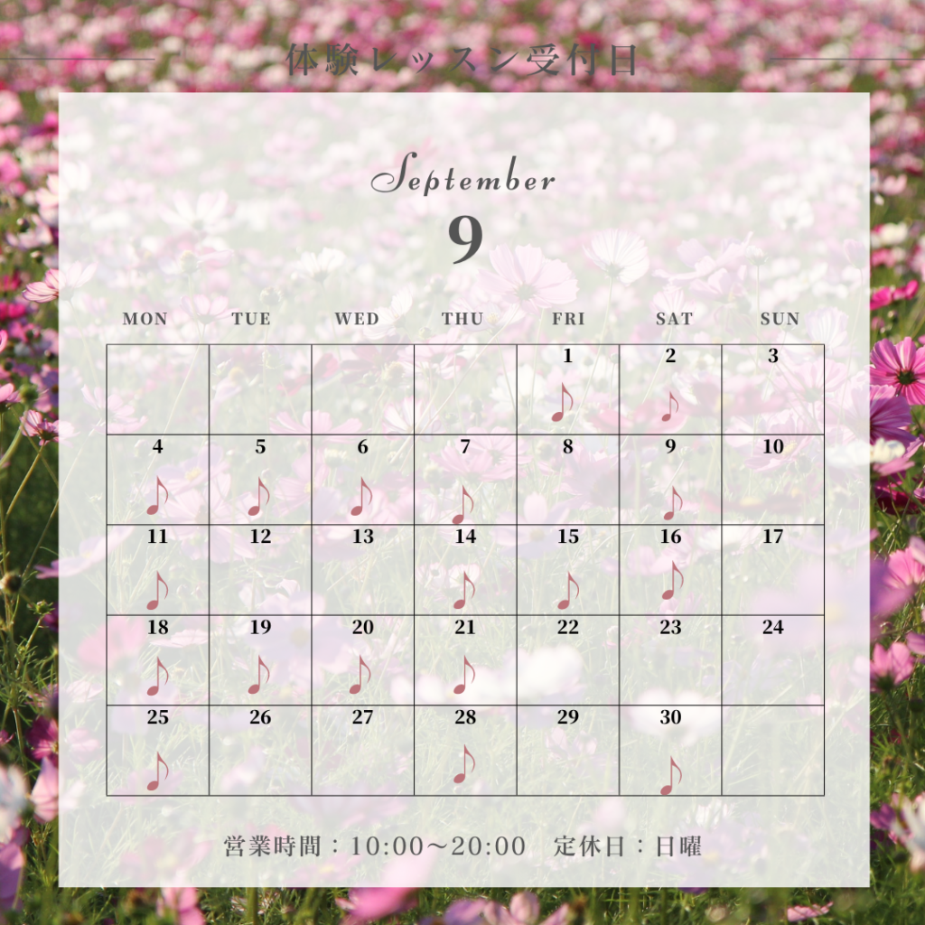 【9月体験レッスン受付日】 ブログ 2023.08.23 【9月体験レッスンスケジュール】🍂秋の体験レッスン🍂受付始まります💁🏼♀️🧑🏻💼宇部教室・山口教室👧楽器によって対応できるお時間が異なります。お気軽にご希望のお時間をお問い合わせください💐一人一人の方とのご縁を大切にし、講師一同心よりお待ちしております☺️